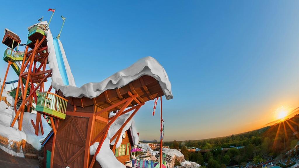– Melt-Away Bay uma piscina de ondas de 1 acre na base do Mount Gushmore. Esta atração é constantemente alimentada pelas cachoeiras de “gelo derretendo”, criando pequenas ondas.