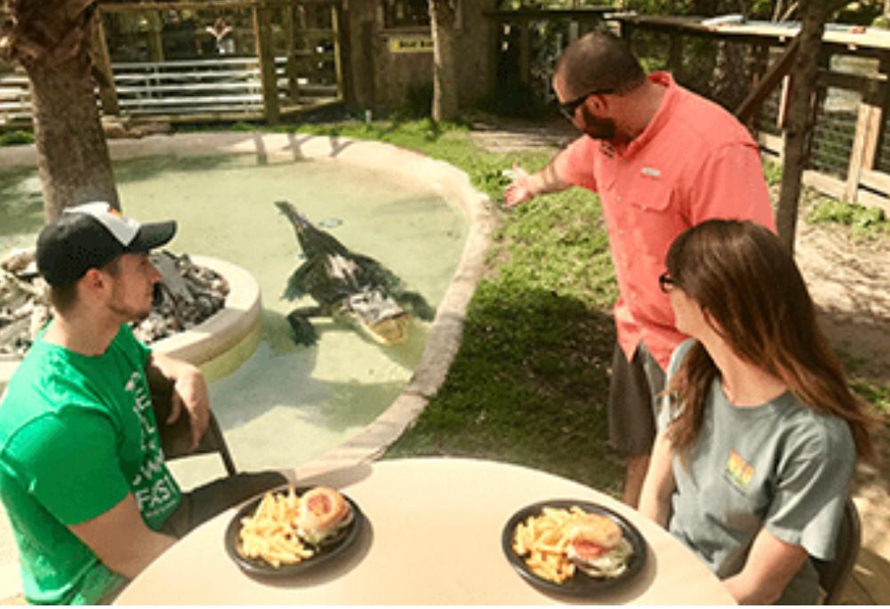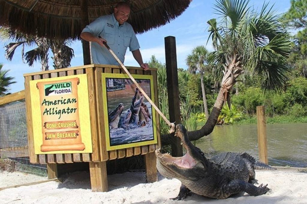 No Gator Feeding Show você verá a força e a velocidade do jacaré americano e irá aprender quão forte é a mordida e quão alto eles podem pular fora da água.