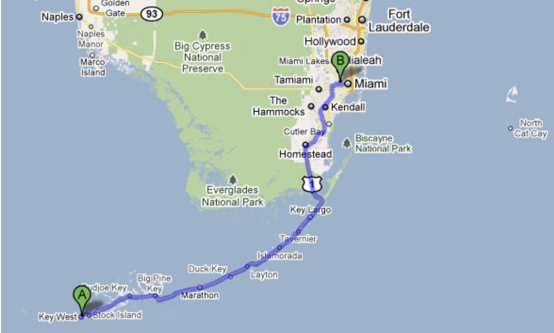 São 3:30h de Miami, fomos de carro e a viagem é um espetáculo pois a estrada ela e suspensa pelo mar é incrível!!!