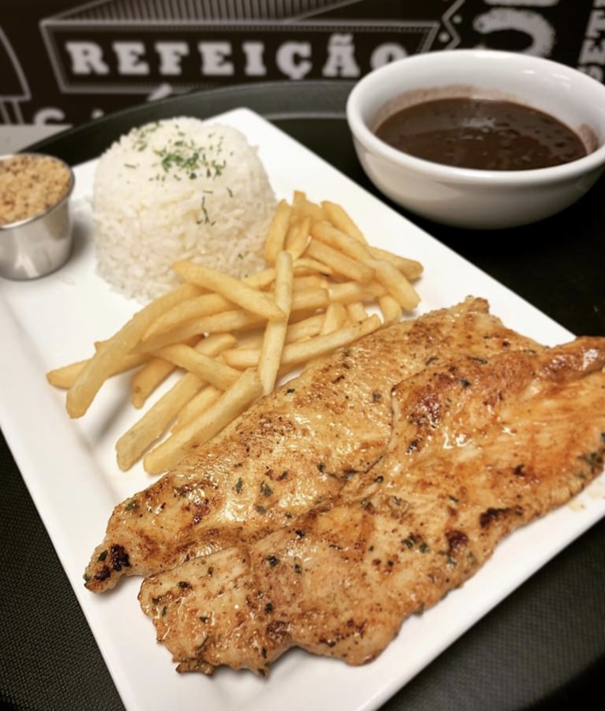 Filé de Frango – gregalhado – arroz, feijão, batata frita e farofa.