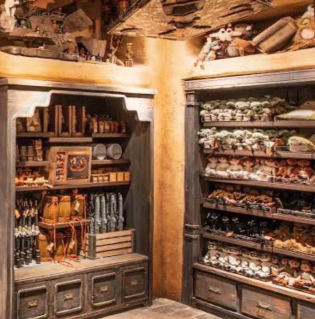 Sua fantástica vitrine está repleta de caixotes de suprimentos para fabricar brinquedos incluindo um cavalinho de balanço de tauntaun.