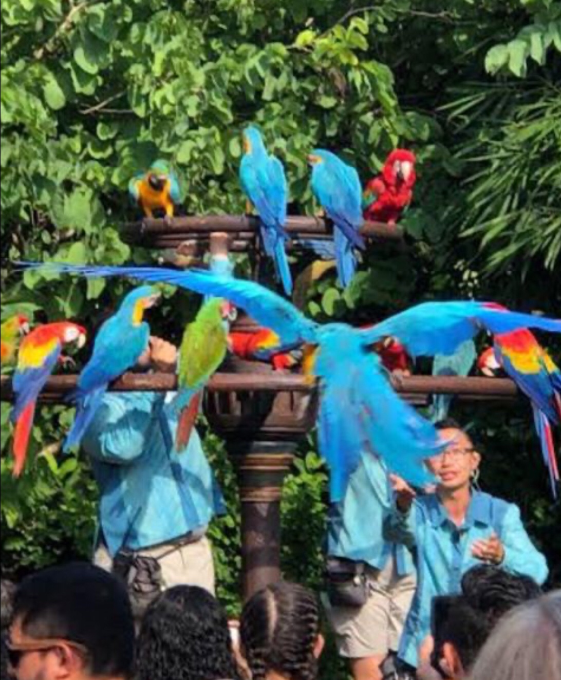 Os pássaros multicoloridos abrem as asas e sobrevoam a Discovery Island.