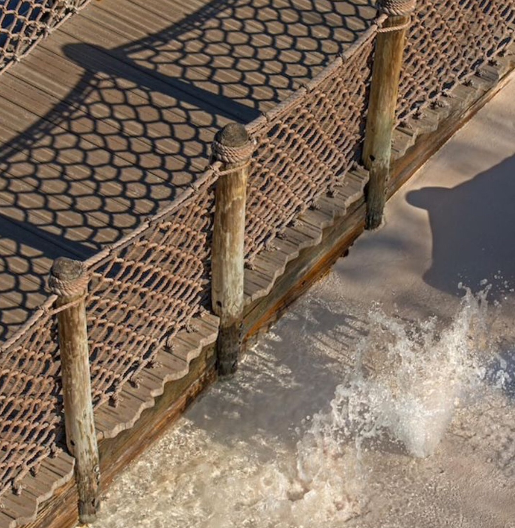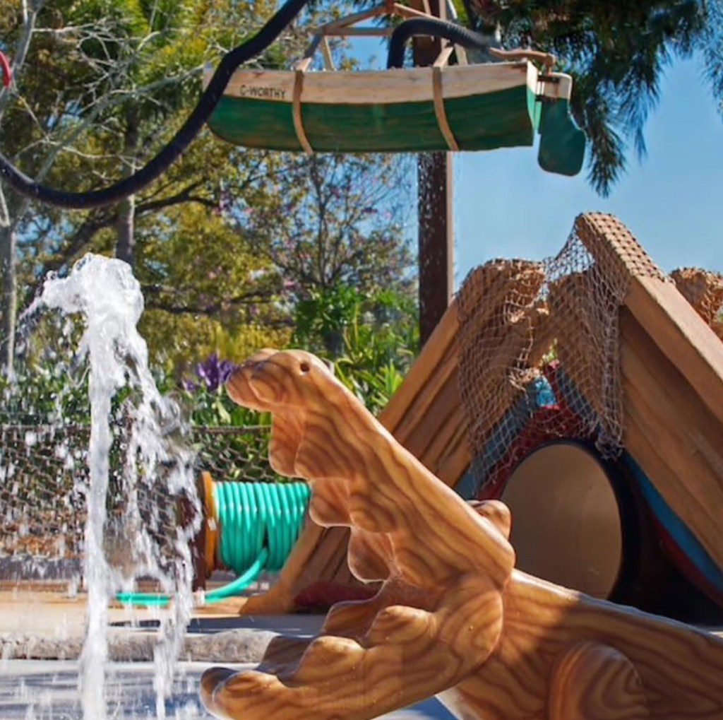 Canções infantis e uma prainha com areia tornam esse o playground perfeito para crianças que adoram água.