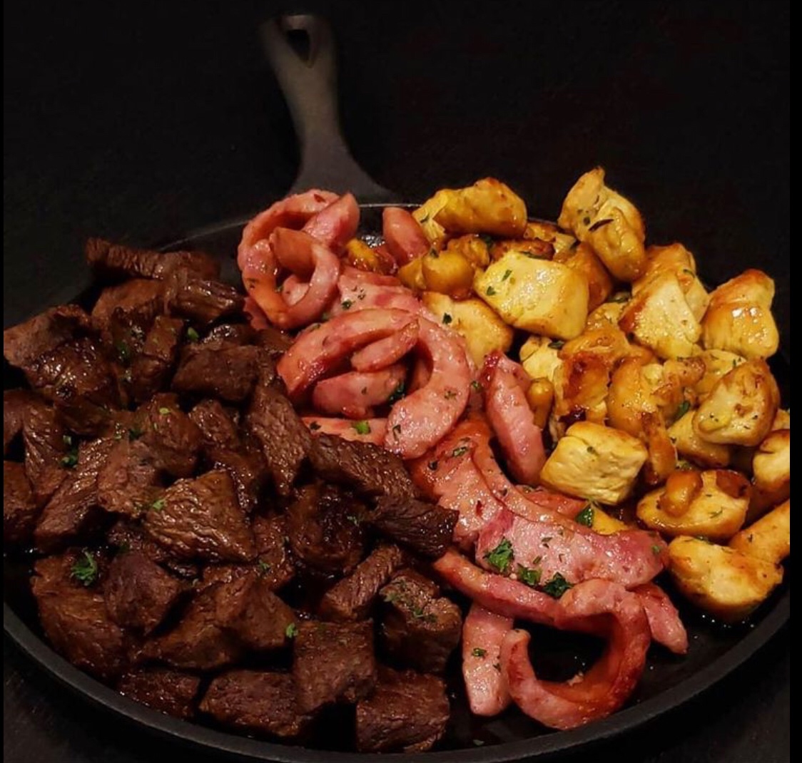 Lá você vai encontrar: pastel de bacalhau, sanduíche de mortadela, coxinha, batatas-fritas, lanches, picanha fatiada e grelhada, sobremesas, churros, tem um cardápio bem variado.
