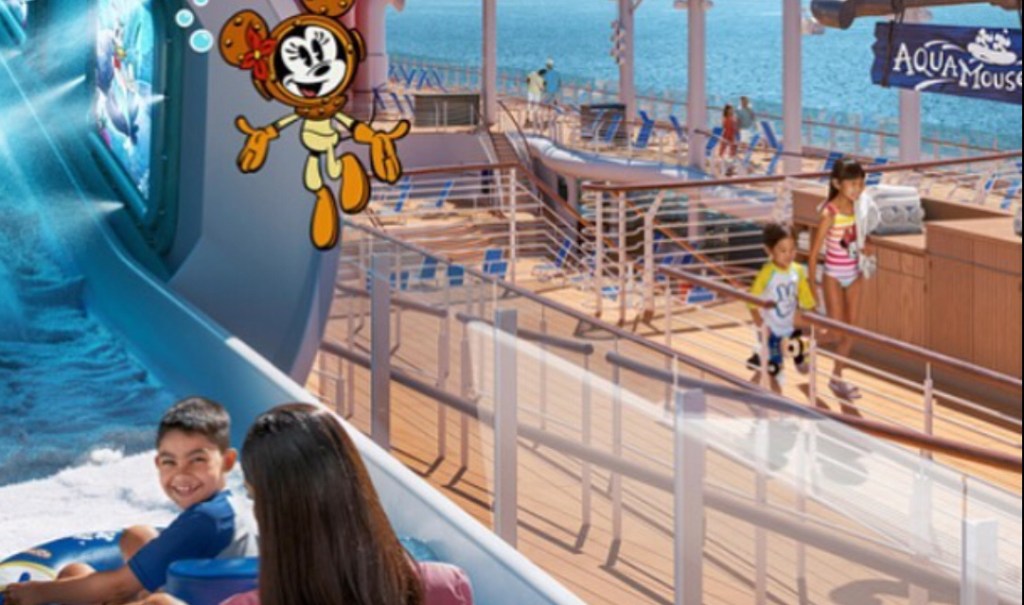 Você mergulhará nos curtas animados de “O Maravilhoso Mundo do Mickey Mouse” a bordo da primeira atração da Disney no mar, o AquaMouse . Completo com cenas de show, iluminação e efeitos especiais, além de surpresas espetaculares, este passeio na água selvagem certamente encantará todos na família enquanto eles zigam, zagam e fazem zoom por meio de tubos sinuosos de 760 pés suspensos bem acima dos decks superiores.