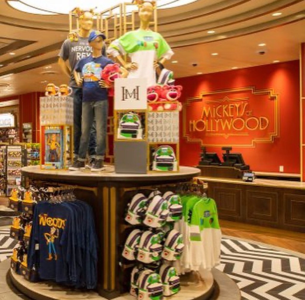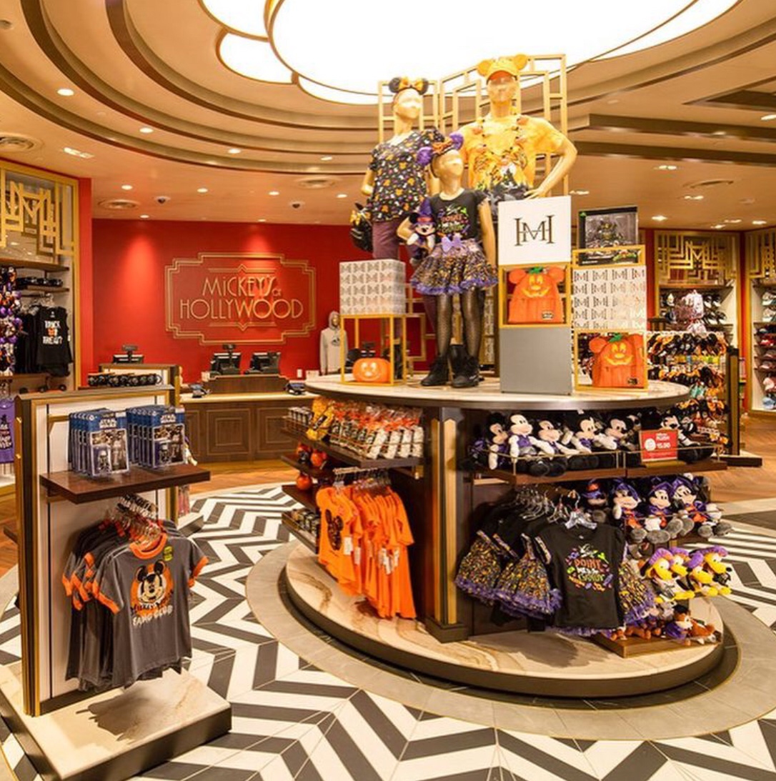 Se você olhar para o teto, poderá encontrar um esquema elegante de quadrados e detalhes em ouro que criam uma atmosfera glamorosa. Mercadorias Arendelle Aqua e Halloween podem ser encontradas também.