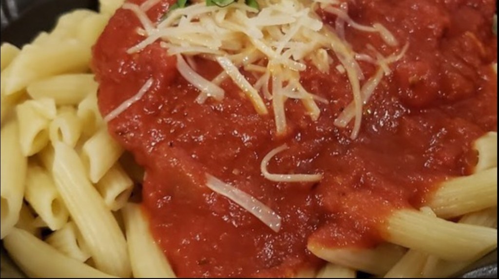 Você vai encontrar: penne, macarrão com frango, nuggets, batata frita, lanches, pizza, tiras de frango empanado, pãozinho trançado de alho, saladas, o cardápio é bem vasto, não tem como você ficar com fome.