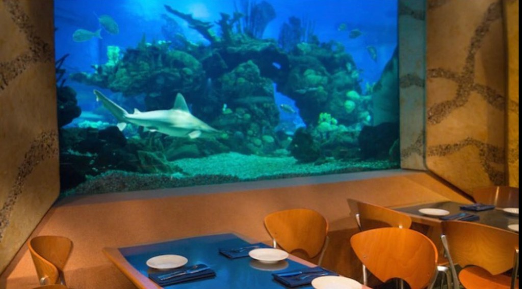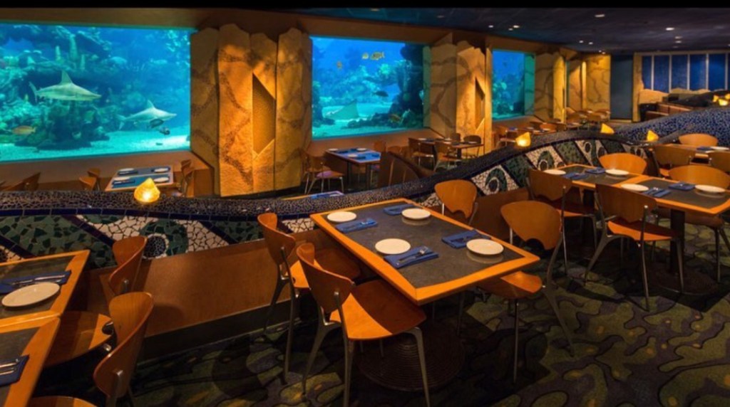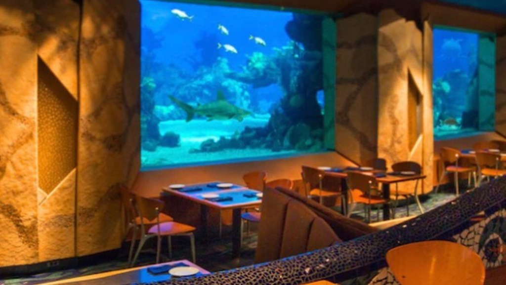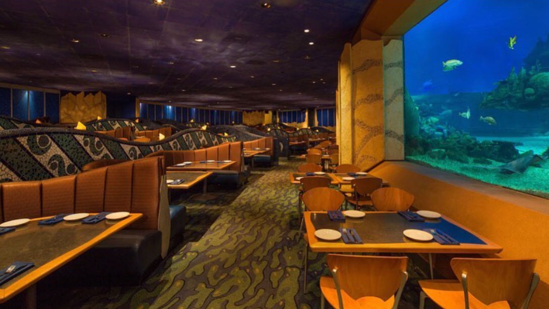 Durante a refeição, procure tubarões, tartarugas marinhas e arraias. Você pode até mesmo avistar um Mickey mergulhador se divertindo embaixo d’água!