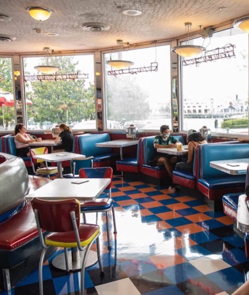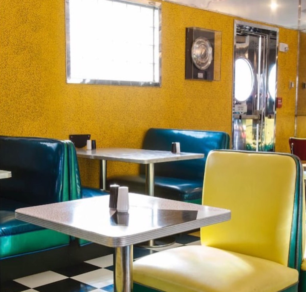 Escolha entre hambúrgueres e batatas fritas, sanduíches de frango, frango empanado, anéis de cebola, refrigerantes e milkshakes. Jante dentro de um estande de vinil clássico ou do lado de fora sob o brilho das luzes de neon.