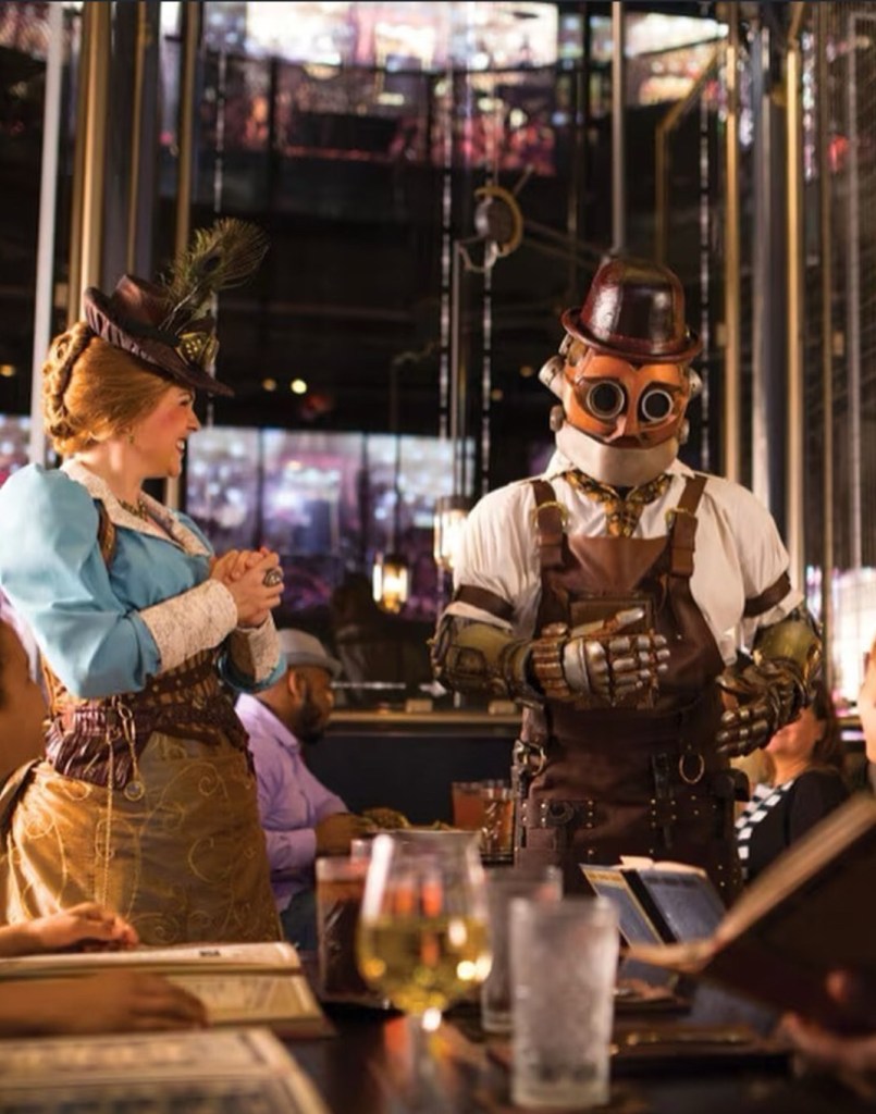 Delicie seu paladar com pratos fantásticos, incluindo bife, frutos do mar, crepes, milkshakes, chocolates gourmet e sobremesas únicas no novo restaurante e confeitaria de serviço completo na Universal CityWalk. Refeições extraordinárias esperam por você neste encantador estabelecimento gastronômico inspirado em Steampunk, com tema do século XIX.