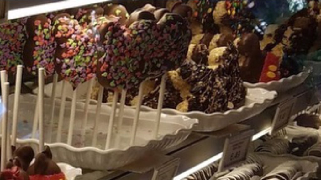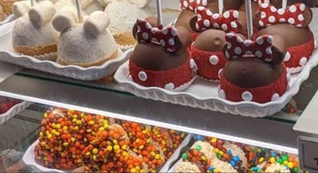 Pela gigantesca janela panorâmica, delicie-se com as maçãs da Minnie Mouse, pretzels com cobertura de chocolate, pedaços gigantes de caramelo e muito mais.